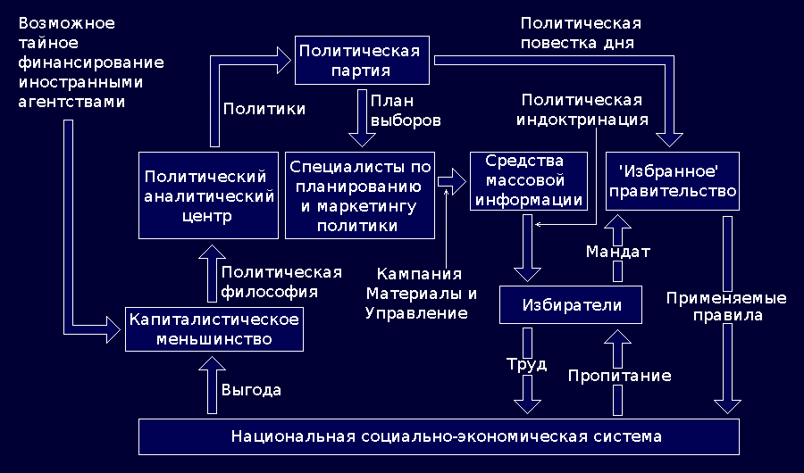 Процесс разворачивается следующим образом. Капиталистические интересы нации сначала коллективно создали аналитический центр политики, состоящий из людей, которые погашают долг своего труда, используя свои умственные способности для создания осязаемой политики, которая ускорит политическую философию капиталистов неограниченного частного приобретения. Затем это капиталистическое меньшинство образует политическую партию. Это финансируется как индивидуально, так и коллективно самими членами этого капиталистического меньшинства. Затем партия составляет манифест, в котором подробно описывается, как — оказавшись у власти — партия намерена реализовать политику, сформулированную их политическим аналитическим центром.