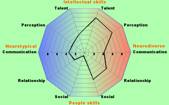 Эти тесты определили, что у меня от 67% до 87% нейроразнообразия, что, насколько я могу судить, означает, что у меня форма высокофункционального аутизма, ранее называвшаяся синдромом Аспергера. Мой коэффициент аутистического спектра [AQ] в результате веб-теста, разработанного Центром исследования аутизма в Кембридже, составляет 44.