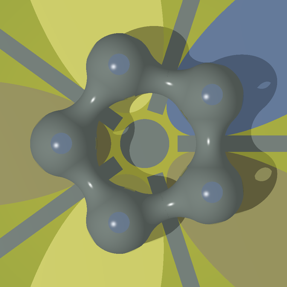 A plan (vertical) view of the 5-module version of my landshare-based Experimental Farmlet is shown on the right. The two-landshare gleba comprises a central 2-hectare circle of private land. The 5 ellipsoidal petals radiating from the centre are 4 crop areas and a lake. These represent the arable and fresh water portions of the Earth's habitable land. At the centre of the farmlet lies the dwelling. This comprises a ring of 5 ellipsoidal accommodation units connected by merged-in bridges. The dwelling surrounds a circular garden, which features a Red Indian style counsel fire set within a paved circle. Five spur roads radiate from the dwelling.