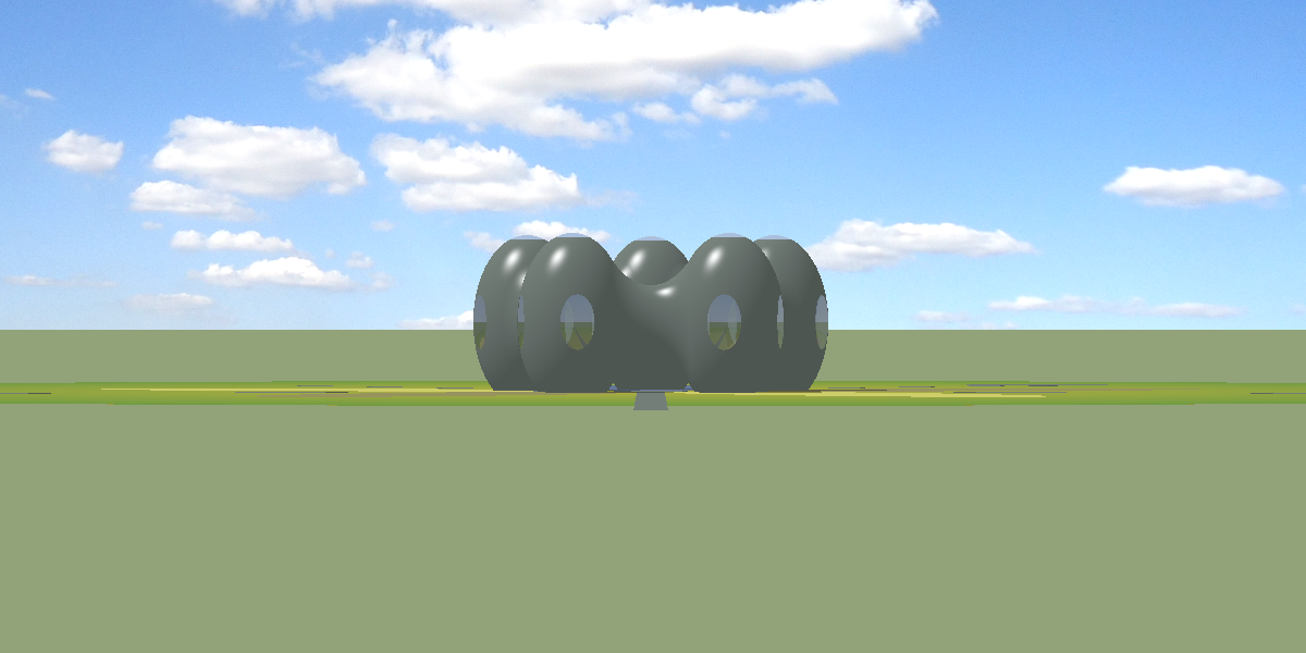 The 5 ellipsoidal accommodation units of the dwelling are spheres which have been elongated to the Golden Ratio times their horizontal radius in the vertical direction only, thus forming egg shapes.