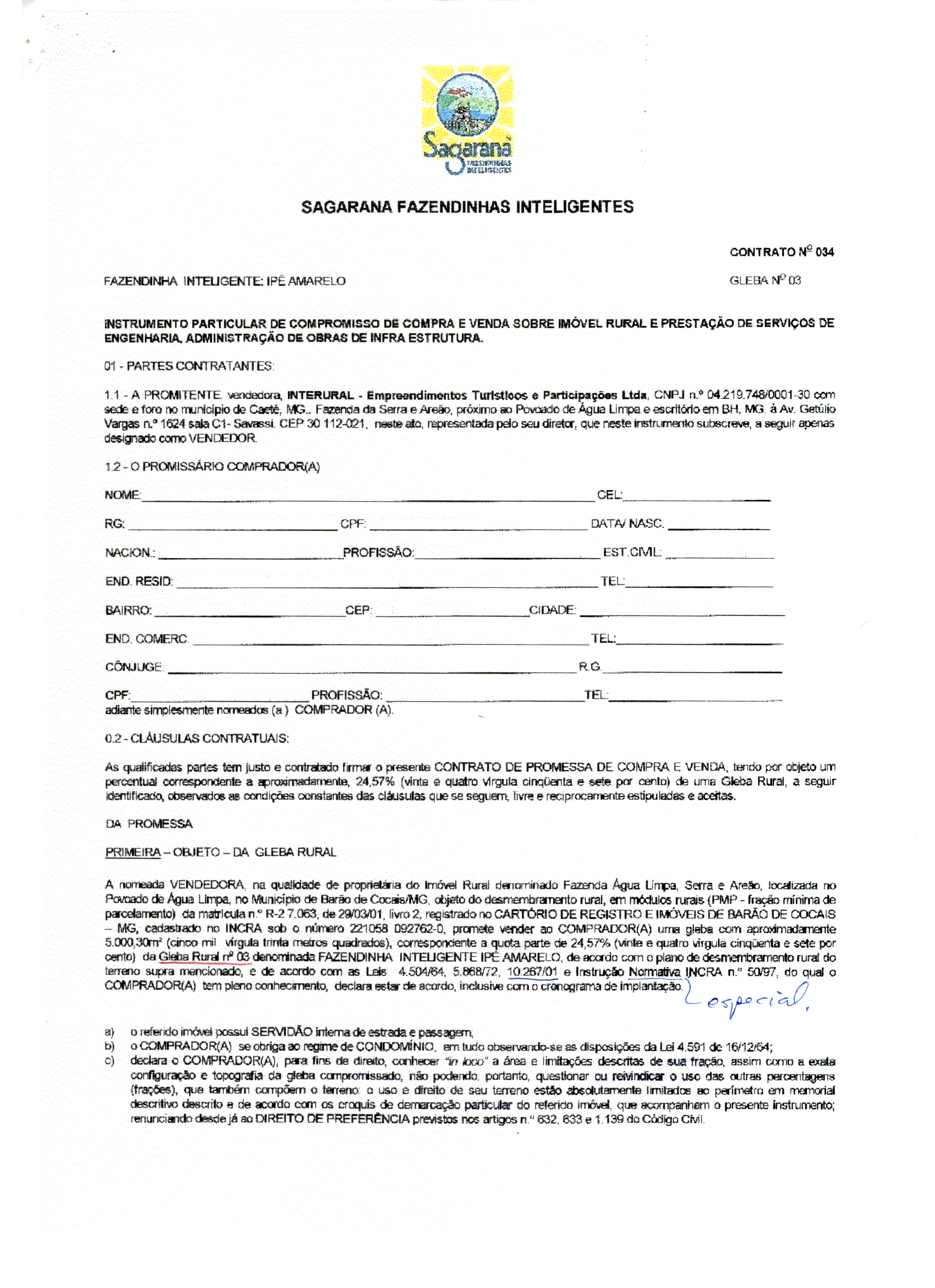 The First Clause then goes on to specify the object of the promise to sell and to buy. It states that the vendor promises to sell to the buyer a gleba, which is the Portuguese word for a contiguous plot of land of unspecified size.