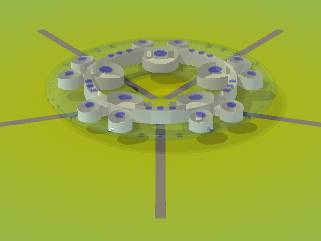 My general evaluation of this more advanced torus design is that, although the shape of the torus envelope is simple and smooth, it is very imposing and restrictive as regards the arranging of internal activity spaces. As a final experiment with this pentagonal arrangement, I therefore reverted to enclosing activity spaces individually with ellipsoidal envelopes, while keeping the same arrangement of activity spaces. I supported the individual activity-space envelopes by enclosing them within a toroidal framework of metal tubing. The result, generated by POVray using the program lardocecu2.pov, is shown below.