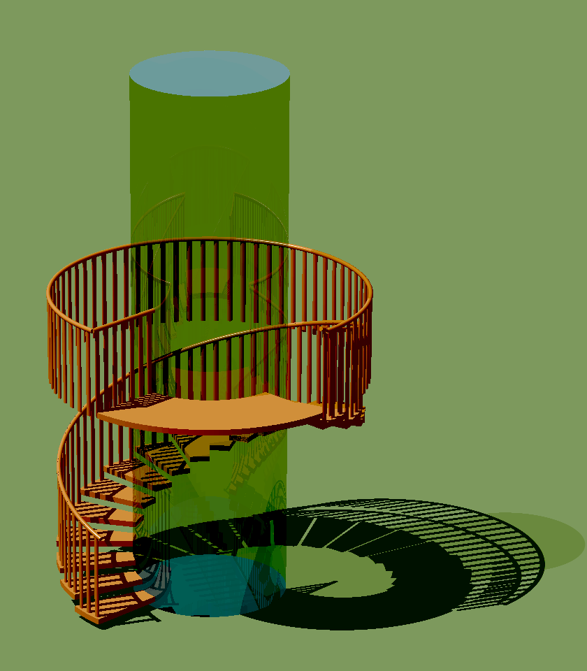 A view of the lift-shaft and its encircling staircase is shown on the left. It is shown in isolation from the entrance hall module in which it is installed. The annular upper floor of the entrance hall, which surrounds the staircase, is not shown. The lift-shaft cylinder is shown in a transparent material. This is really just to make visible the path of the stairs as they pass behind the lift-shaft. Nonetheless, it could be a valid material for the lift-shaft. The staircase itself is shown in wood, although other suitable materials could be used. The staircase is viewed, in this illustration, from the direction of the door to the Kitchen/Diner on the upper landing area.