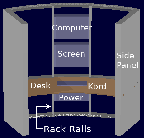 The work space's 8-segment central console is shown on the right. The larger rotating view [click image] better shows the details of its 5 equipped segments. These are: a normal computer work station, file server, a printing and scanning station, communications station and a navigation station. Each equipped segment has a pair of standard 23-inch rack rails at the rear, between which up to 3 standard flat-format 23-inch equipment cabinets may be mounted. Three of the 8 segments are unequipped to facilitate access.