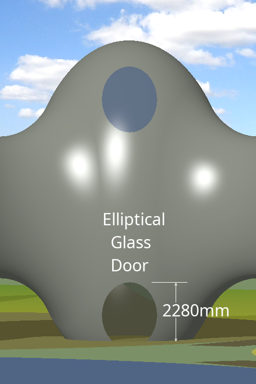 The dwelling is intended to have a minimum possible impact on the planet. For this reason, it impinges on the planet's surface in only 6 small circular areas, each about 19·95 square metres to a maximum depth of only 1·44 metres. The Entrance Hall (one of the 6 ellipsoidal modules, of which the dwelling is composed) is shown on the right. The main floor of the dwelling is 3·588 metres above the surface of the planet. Entrance to the dwelling, at ground level, is via a motorized door, which is part of the shell wall. There is a lower floor in this module at ground level. People enter and leave the dwelling via this doorway. In the centre of the lower floor is a cylindrical lift shaft surrounded by a helical staircase, which makes a 270° turn around the lift shaft. A cylindrical lift travels within the 2 metre diameter shaft, which ascends through a 4-metre diameter hole to the main floor of the Entrance Hall.