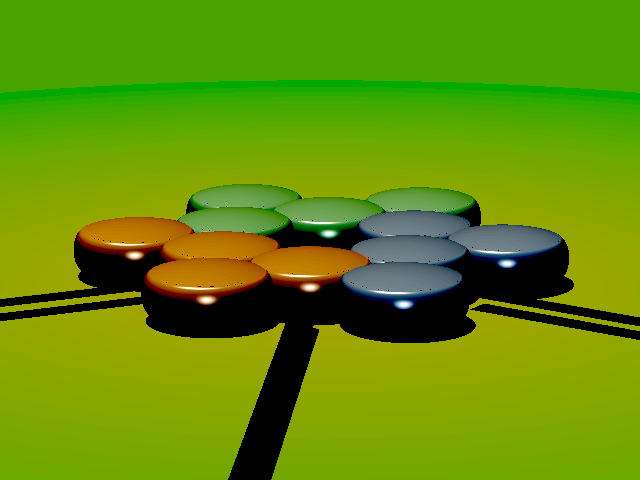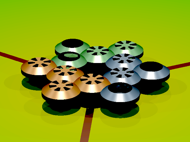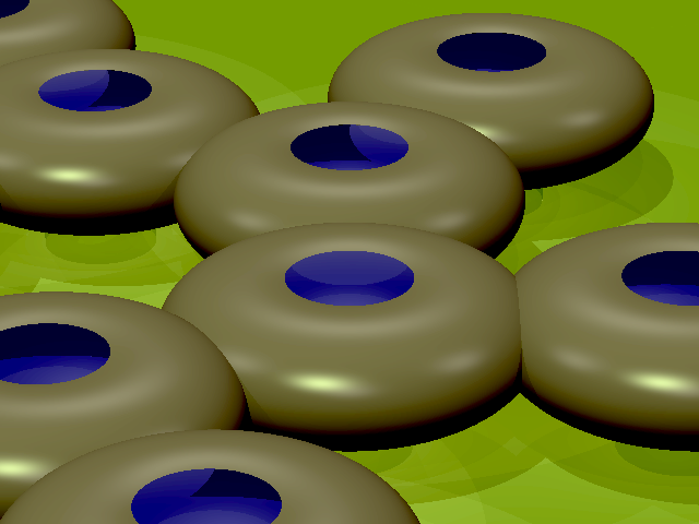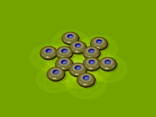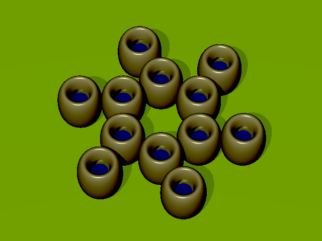 On the right, the barrels are shown in the galaxy configuration as opposed to the snowflake configuration above. The barrels version is aesthetically pleasing and offers easy access to ground level. However, it lends itself less well to vehicular activity. It is also mathematically difficult to merge tori in a seamless way to form interconnecting corridors. Perhaps I shall try this some time. All torus-based versions of the dwelling were generated by toroids.pov