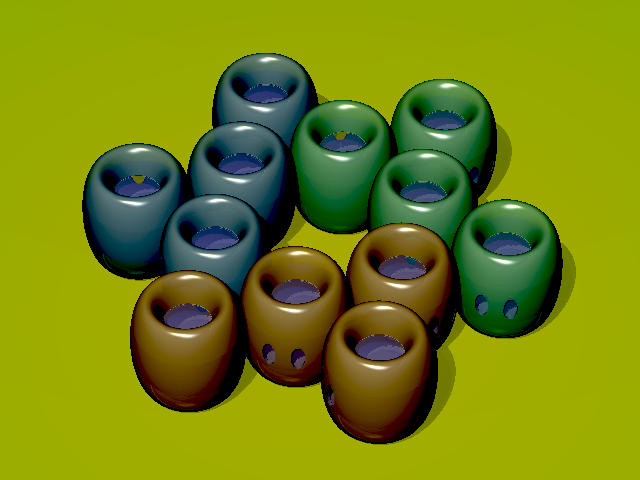 The second cylinder-based version, shown on the right, appears like bulging cylinders. However, each shell is, in fact, made up of a sphere which is truncated top and bottom and capped top and bottom with spherical caps of a much greater radius. The result is that the dwelling appears to be made up of merged inflated cylinders. Hence the name of the POVray program inflatable.pov, which was used to generate it.