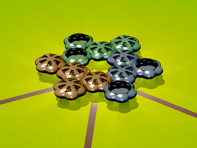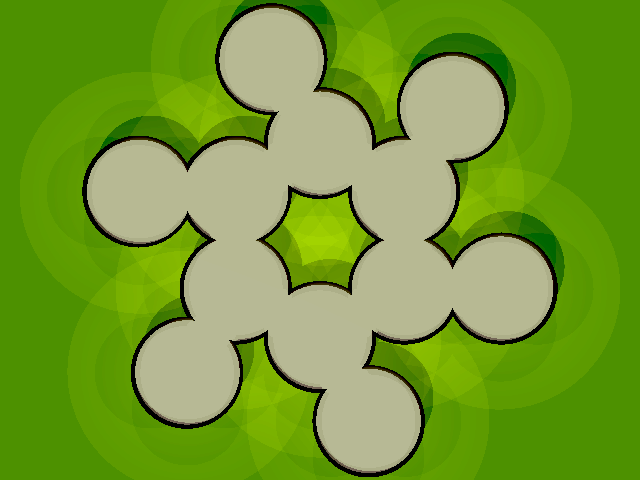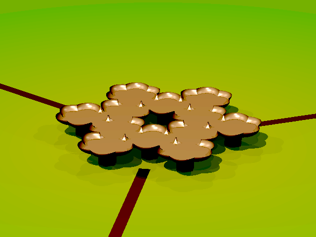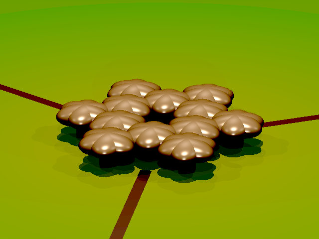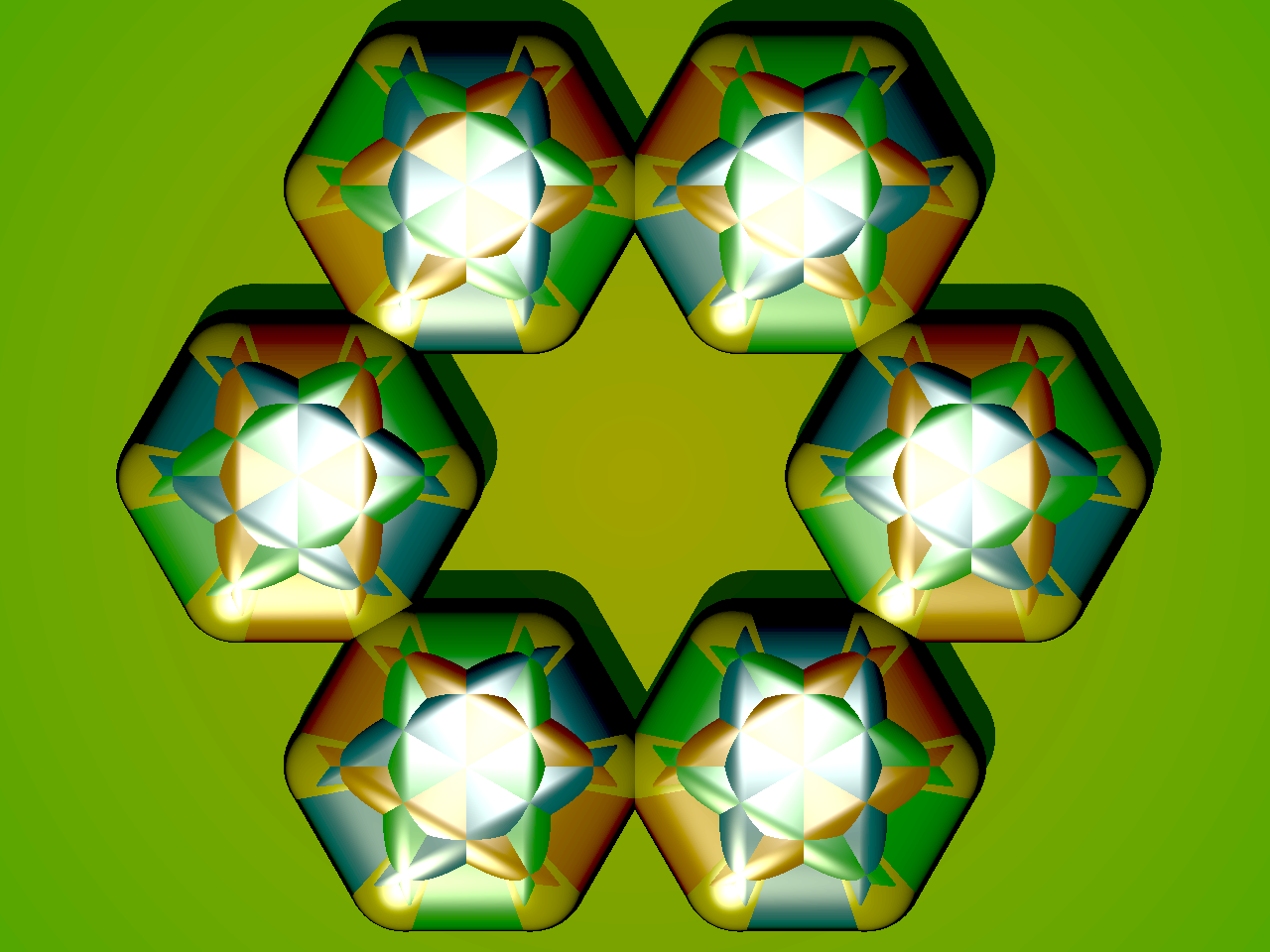 Six of these envelopes (or shells) are then arranged as shown on the right to form the complete dwelling. The shells are oriented so that the points of the hexagons merge, thus creating an access aperture between adjacent shells. This arrangement results in an attractive star-shaped internal garden being created in the middle of the dwelling. This version of the dwelling was generated by POVray using hex.pov
