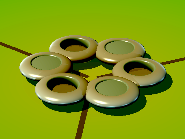 The final variant of the torus which I tried is shown on the left. It comprises the outer section of one torus joined to the inner section of another torus with a different major to minor radius ratio. The result is a torus with a more abrupt inner wall separating the inner circle from the outer rim. This version is particularly useful for creating patios with indoor ante-room space. This version of the dwelling was generated by POVray using rings.pov