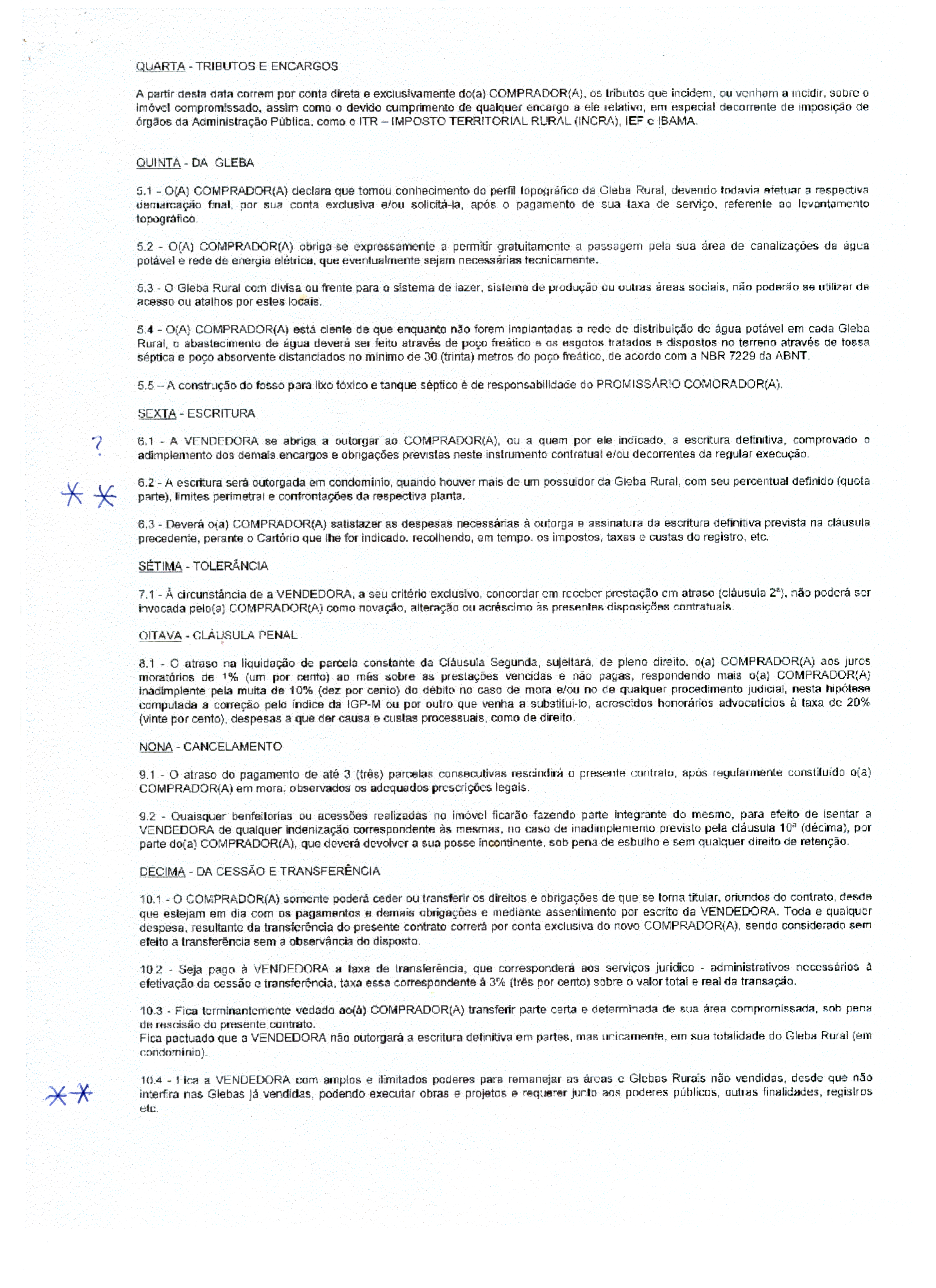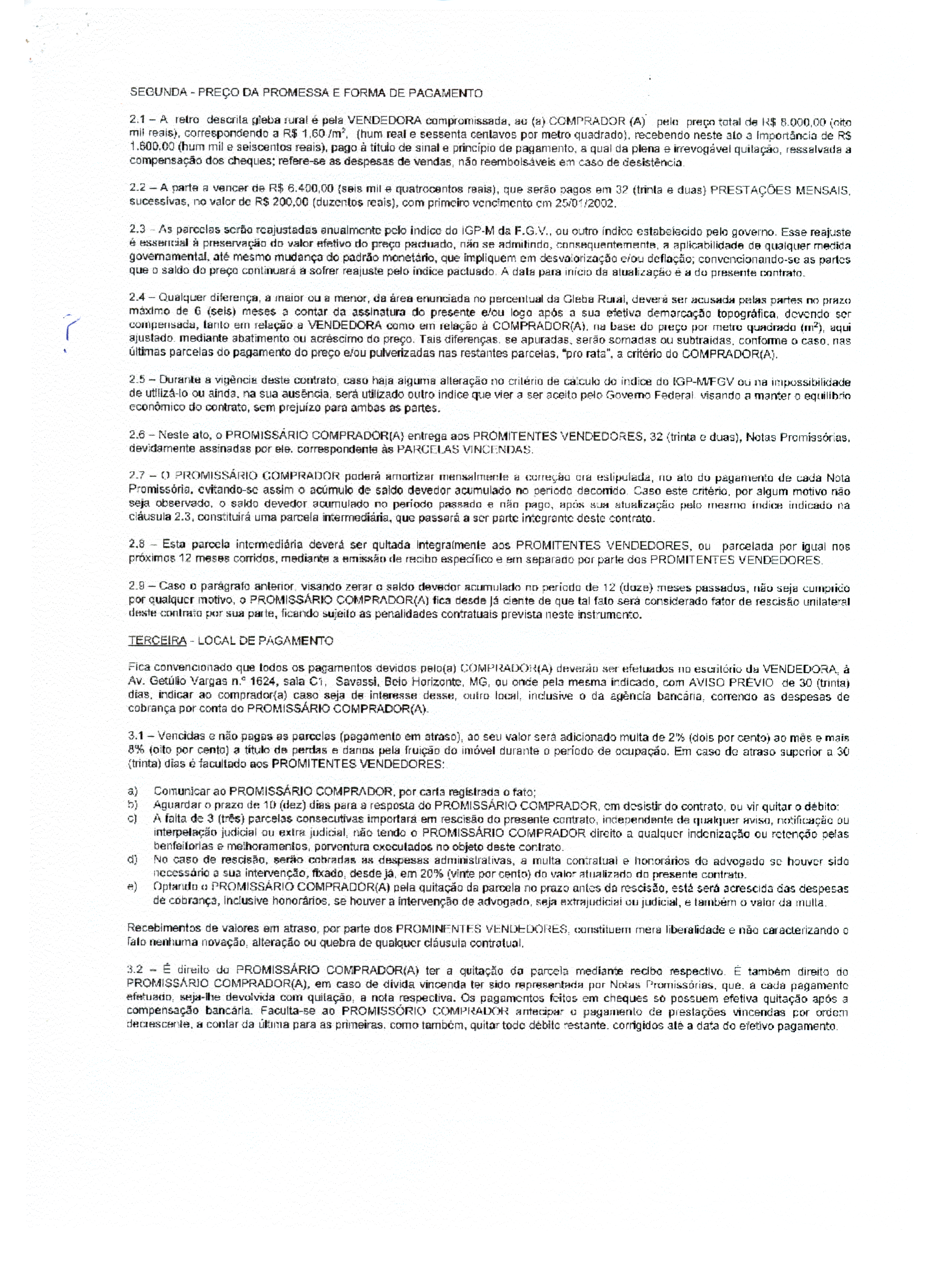 The First Clause then goes on to specify the object of the promise to sell and to buy. It states that the vendor promises to sell to the buyer a gleba, which is the Portuguese word for a contiguous plot of land of unspecified size.