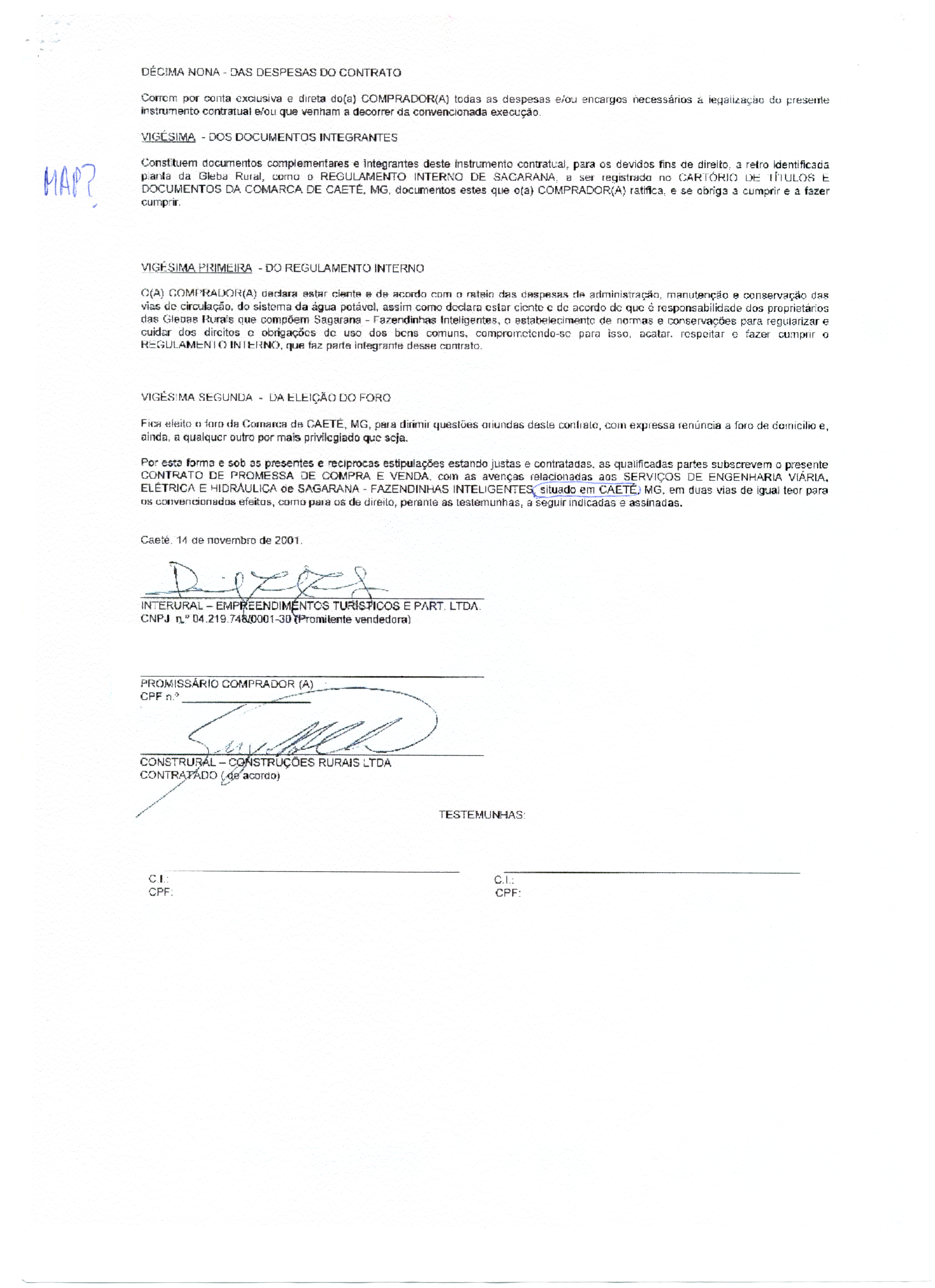 Notwithstanding, in his letter, the vendor tells her that the term "Gleba Rural" in Clause 5.1 refers to the whole of a 20345·65 ±0.1 m² Gleba Rural Nº03 of which her specifically demarcated GLEBA is a part. This does not make sense. As a single private buyer of one particular piece of land, how and why would she be obliged by the "contract" to pay for a survey of land that belongs to other people? Are each of the other "purchasers" also obliged to pay for a professional survey of the whole of Gleba Rural N°03? Presumably so, if their contracts are the same.