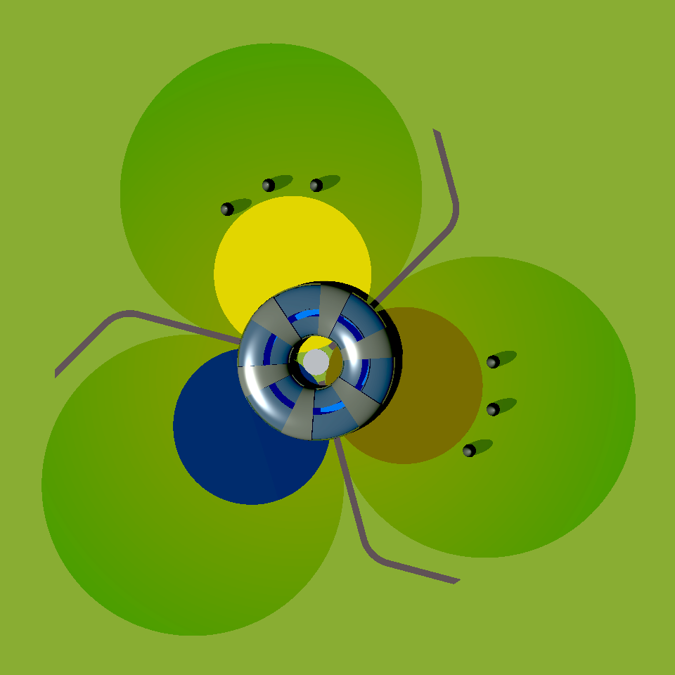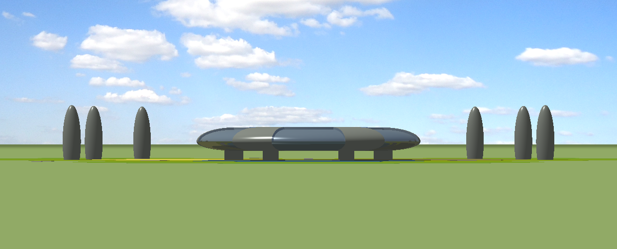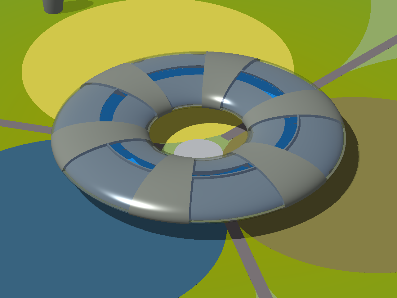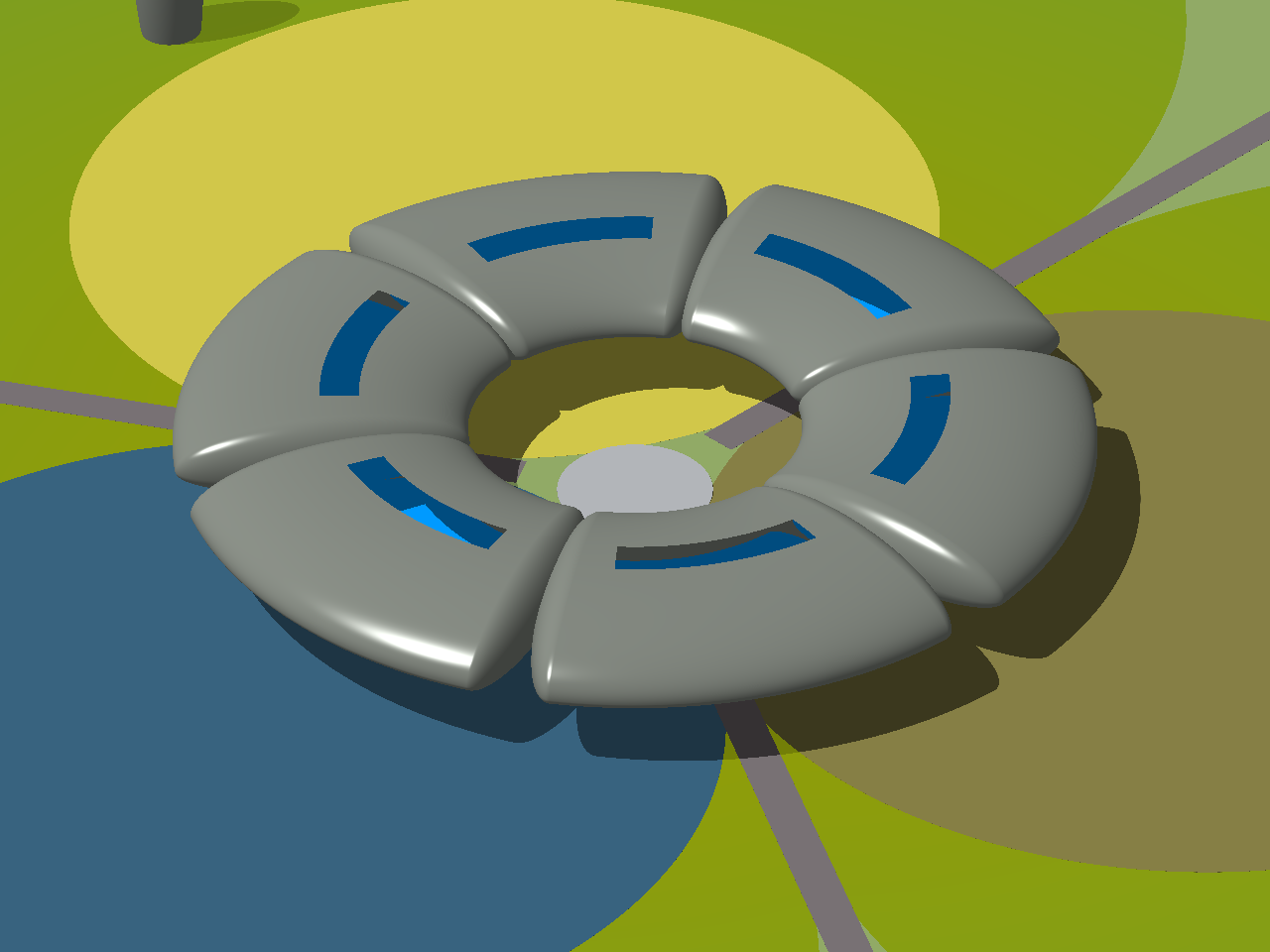 Below is an aerial view, from an elevation of 20°, of the whole gleba with the dwelling, lake and crop areas in the middle. The two sets of 3 tall ellipsoidal objects on the peripheries of the crop circles are service silos. Three single-track radial roads or pathways connect the farmlet to the outside world. The roads continue under the raised dwelling and terminate in the central garden.