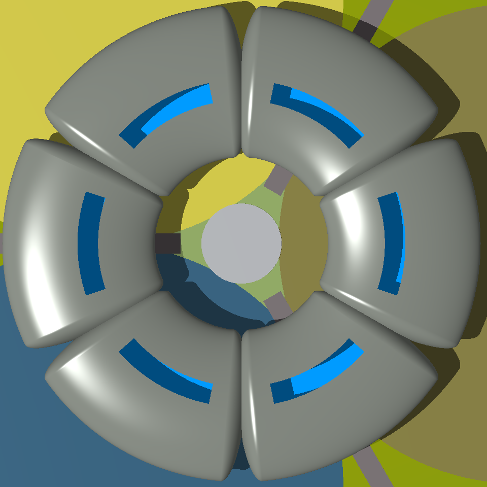 The dwelling comprises two shells: an inner shell and an outer shell. A view of the outer shell can be seen on the left. It comprises 12 toroidal segments: 6 short ones interspersed with 6 long. The short segments are opaque. The long segments are transparent. The lengths (or subtended angles) of the long and the short segments are in the Golden Ratio (~1·618). The 12 segments mate together to form the completely smooth outer toroidal surface of the dwelling.
