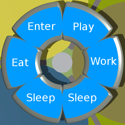 The same plan view is shown on the right, but with the upper half of the inner shell sliced off along the zero horizontal plane. Thus is revealed the inner segmented floor of the dwelling, shown in blue. The words in white show the generic function of each of the 6 segments of the dwelling, although these must always be regarded as flexible. What each segment is used for is decided by the dwelling's occupants and may be varied from time to time. Click on a segment in the adjacent diagram for detailed suggestions for its interior design and layout.