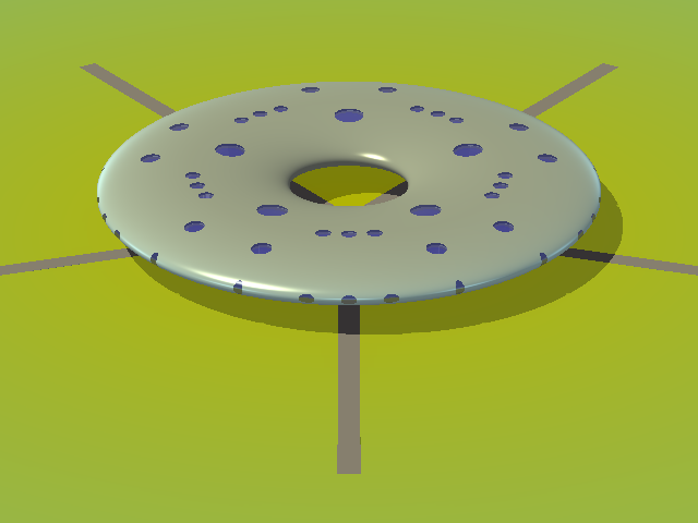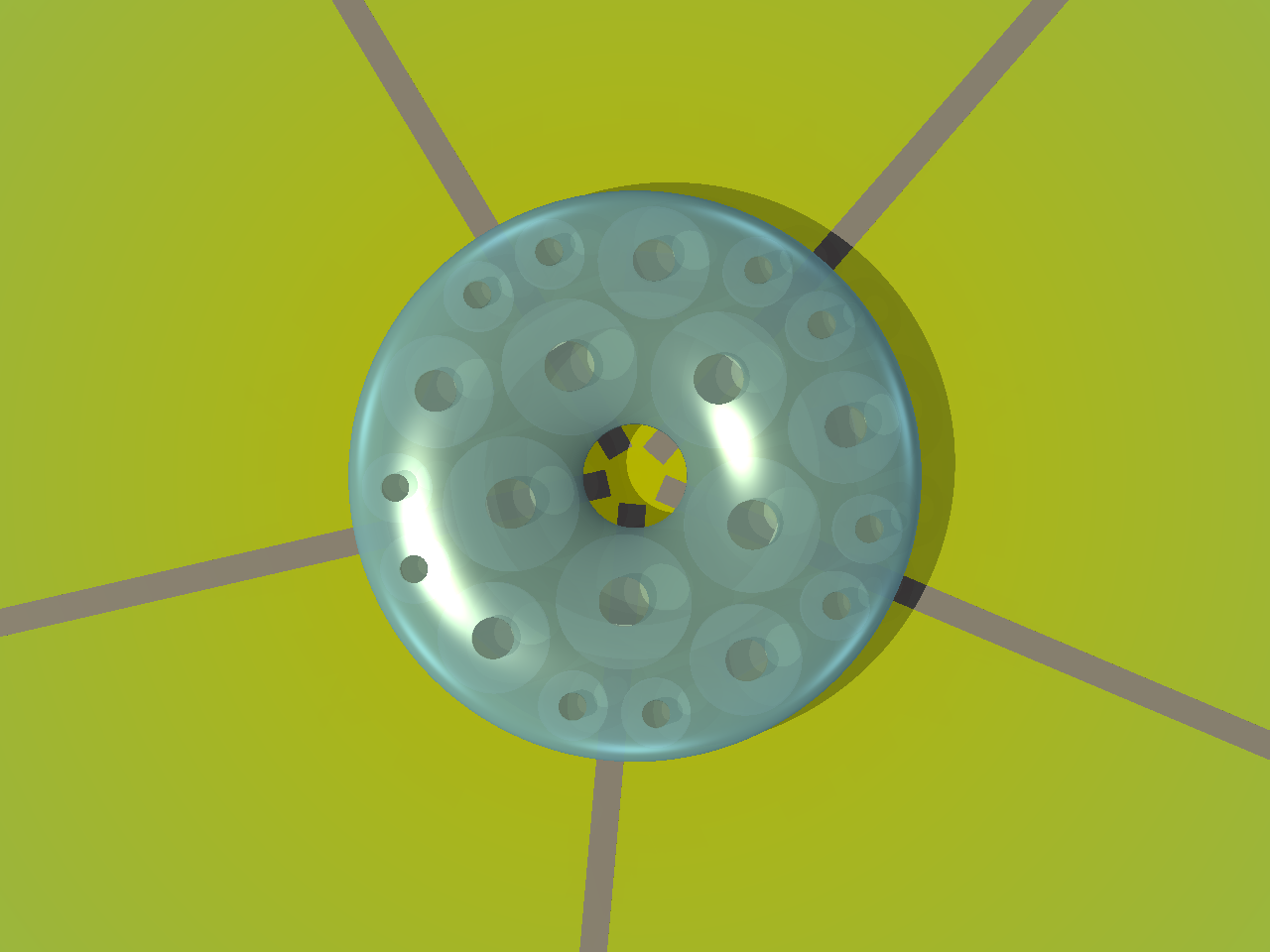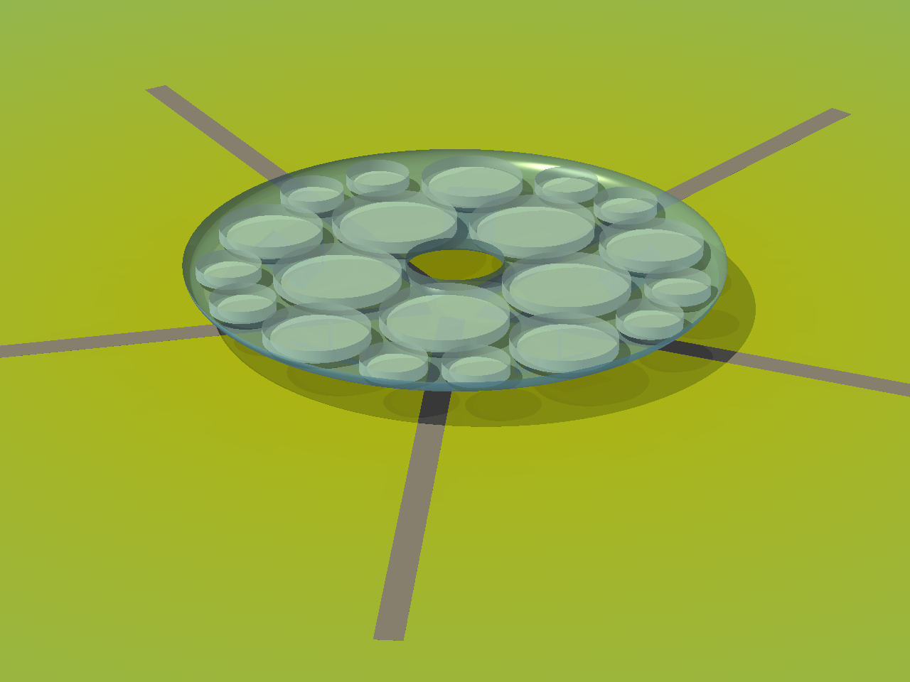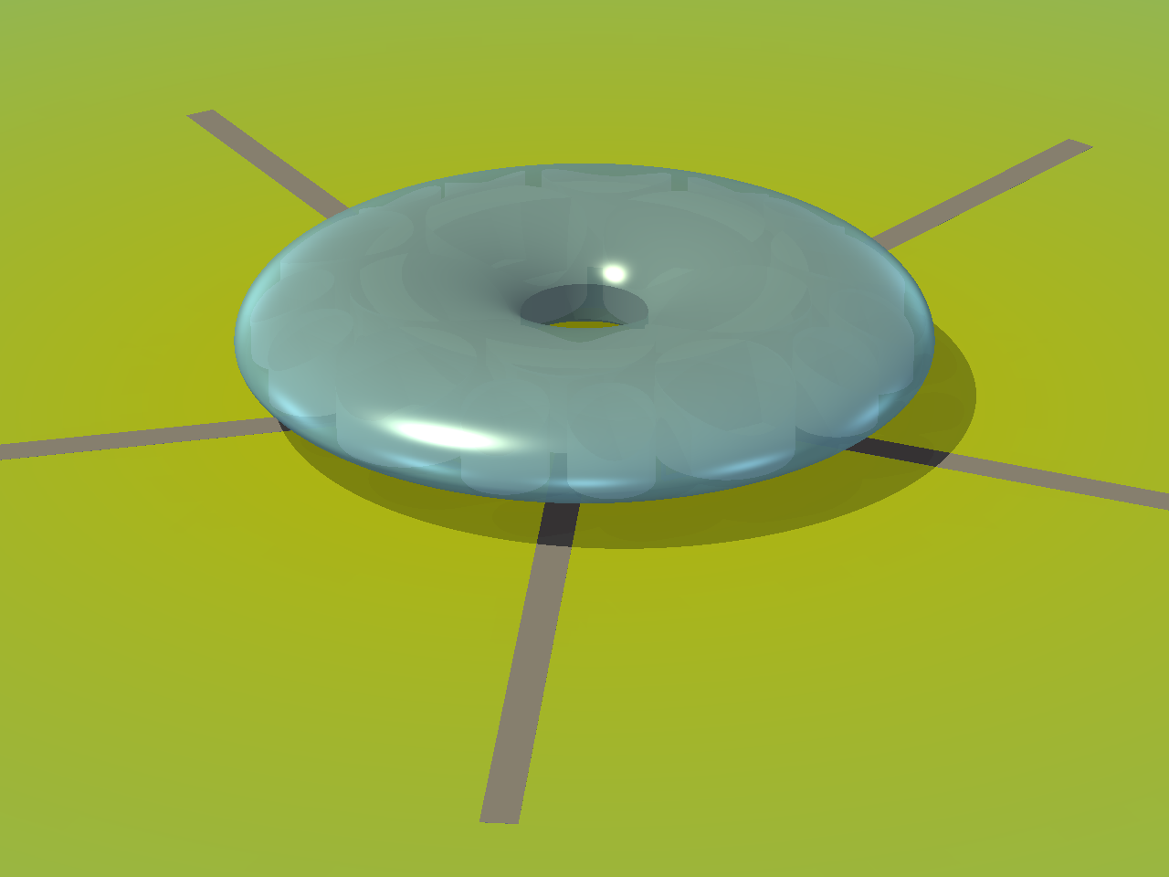 My general evaluation of this more advanced torus design is that, although the shape of the torus envelope is simple and smooth, it is very imposing and restrictive as regards the arranging of internal activity spaces. As a final experiment with this pentagonal arrangement, I therefore reverted to enclosing activity spaces individually with ellipsoidal envelopes, while keeping the same arrangement of activity spaces. I supported the individual activity-space envelopes by enclosing them within a toroidal framework of metal tubing. The result, generated by POVray using the program lardocecu2.pov, is shown below.