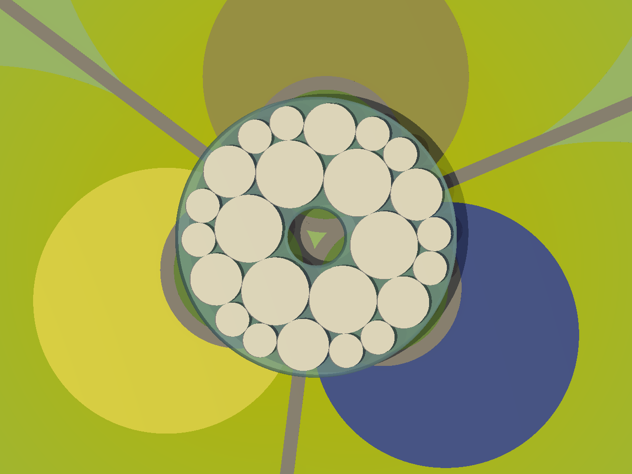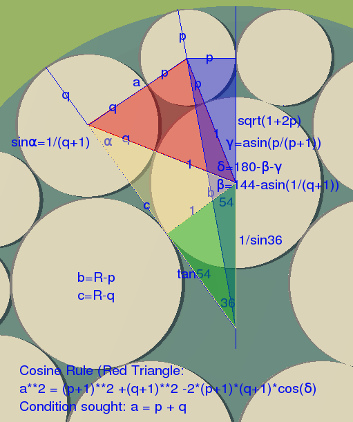 The principles of this rather complicated geometry are illustrated on the left. The Java program uses an iterative method to, in effect, optimise the relative areas of the coloured triangles. In essence, the problem is to find out what other two sizes of circle are required to fit around the outside of the inner pentagon of large circles such that the outer circles all touch both each other and the outer circumference of the torus. This process is what determines the ratio between the major and minor horizontal radii of the torus. Unfortunately, this is what causes the hole in the middle to be much smaller than is desirable for an inner garden.