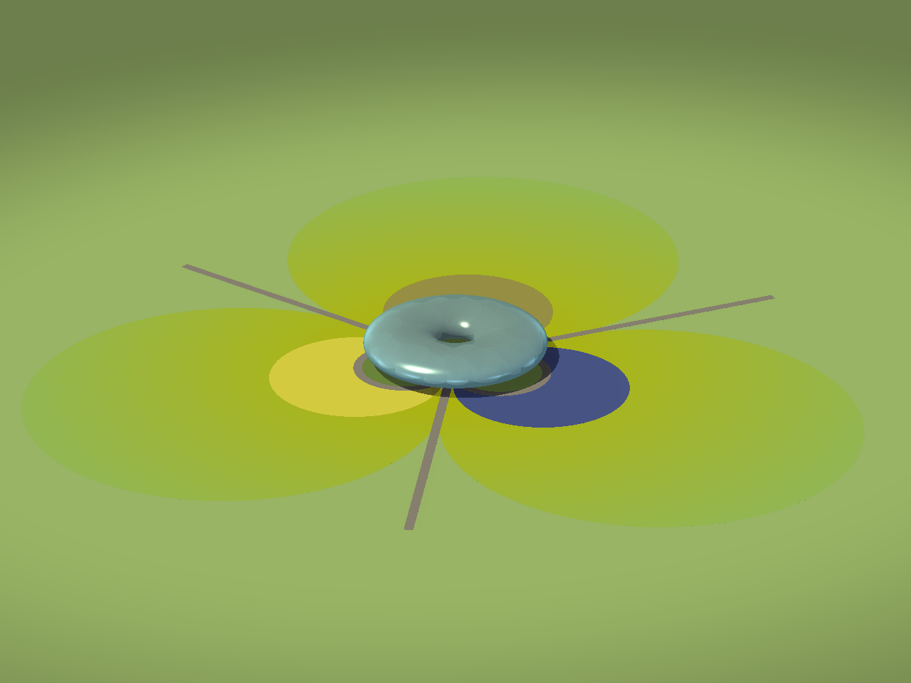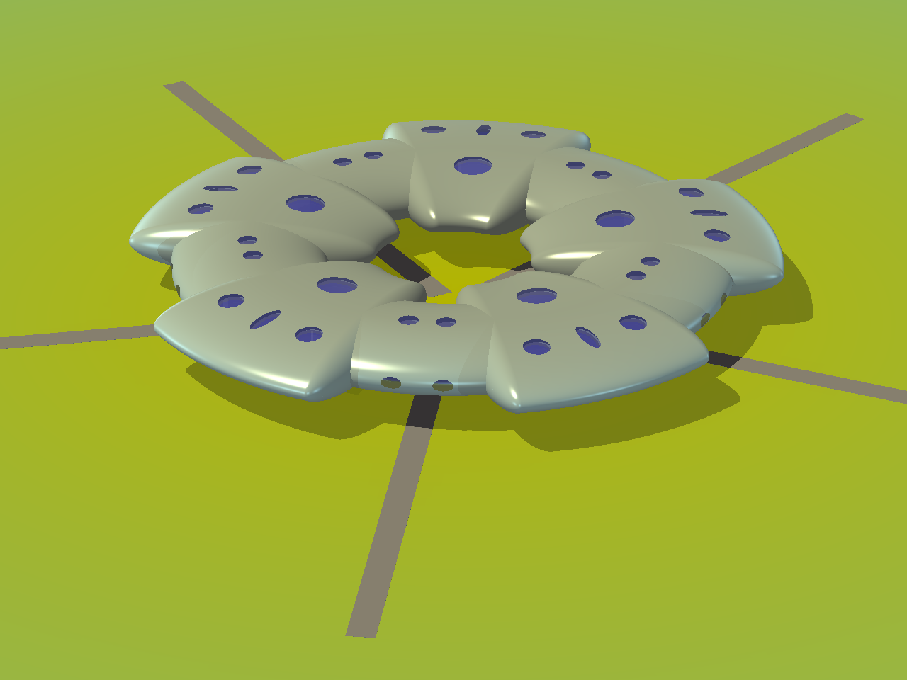 The Torus Flower version of the dwelling was generated by POVray using the program torus-flower.pov. A horizontal panorama of the Torus Flower dwelling is shown below.