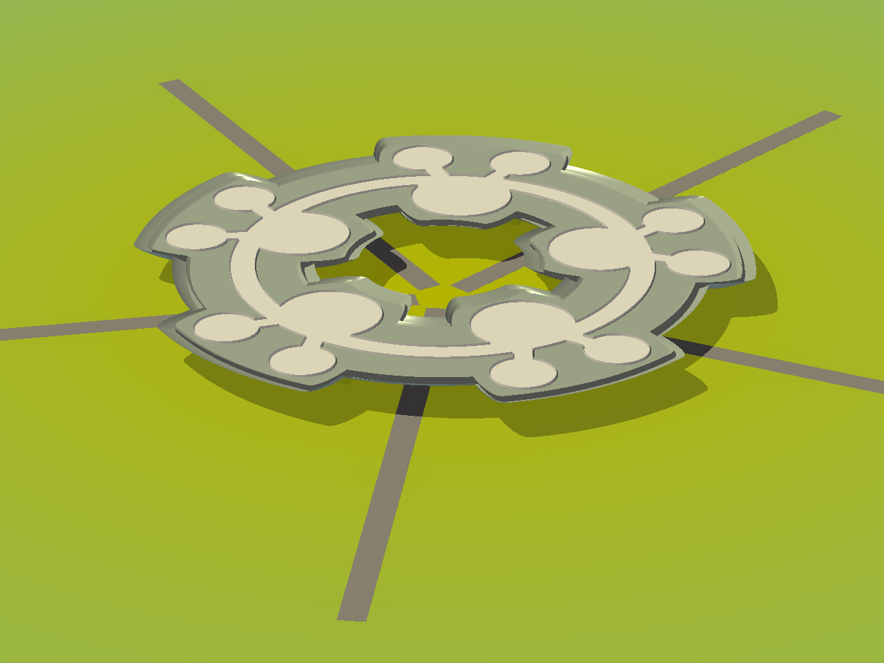 As a final experiment with torus envelopes, I recreated the above version, but this time using a hexagonal rather than a pentagonal arrangement of activity-spaces. This enabled me to set this version of the dwelling within the 3-road gleba format that I had always used, and which I prefer. The illustration on the right shows this final version of the torus dwelling set within the farmlet gleba, with its lake and two crop circles.